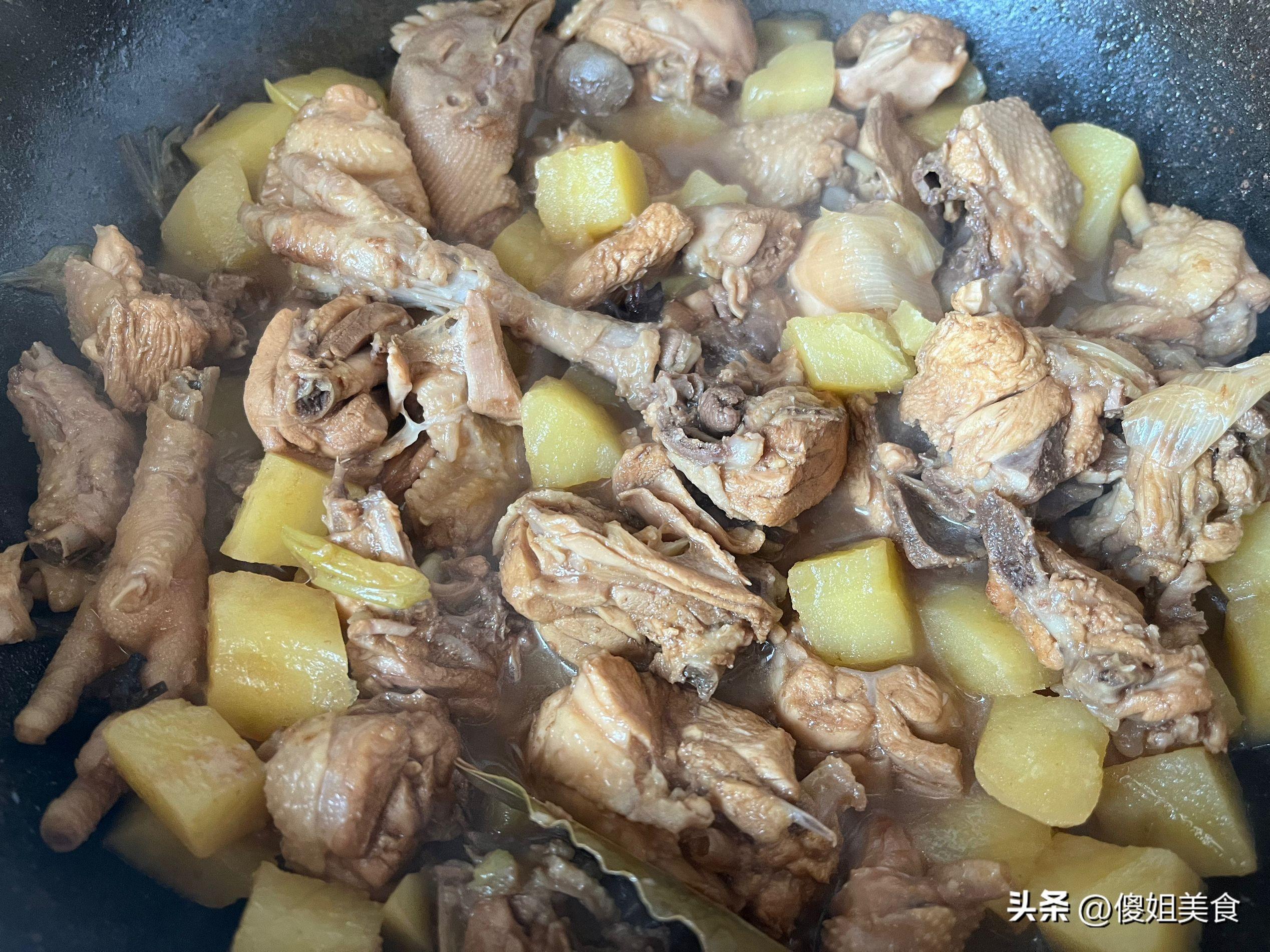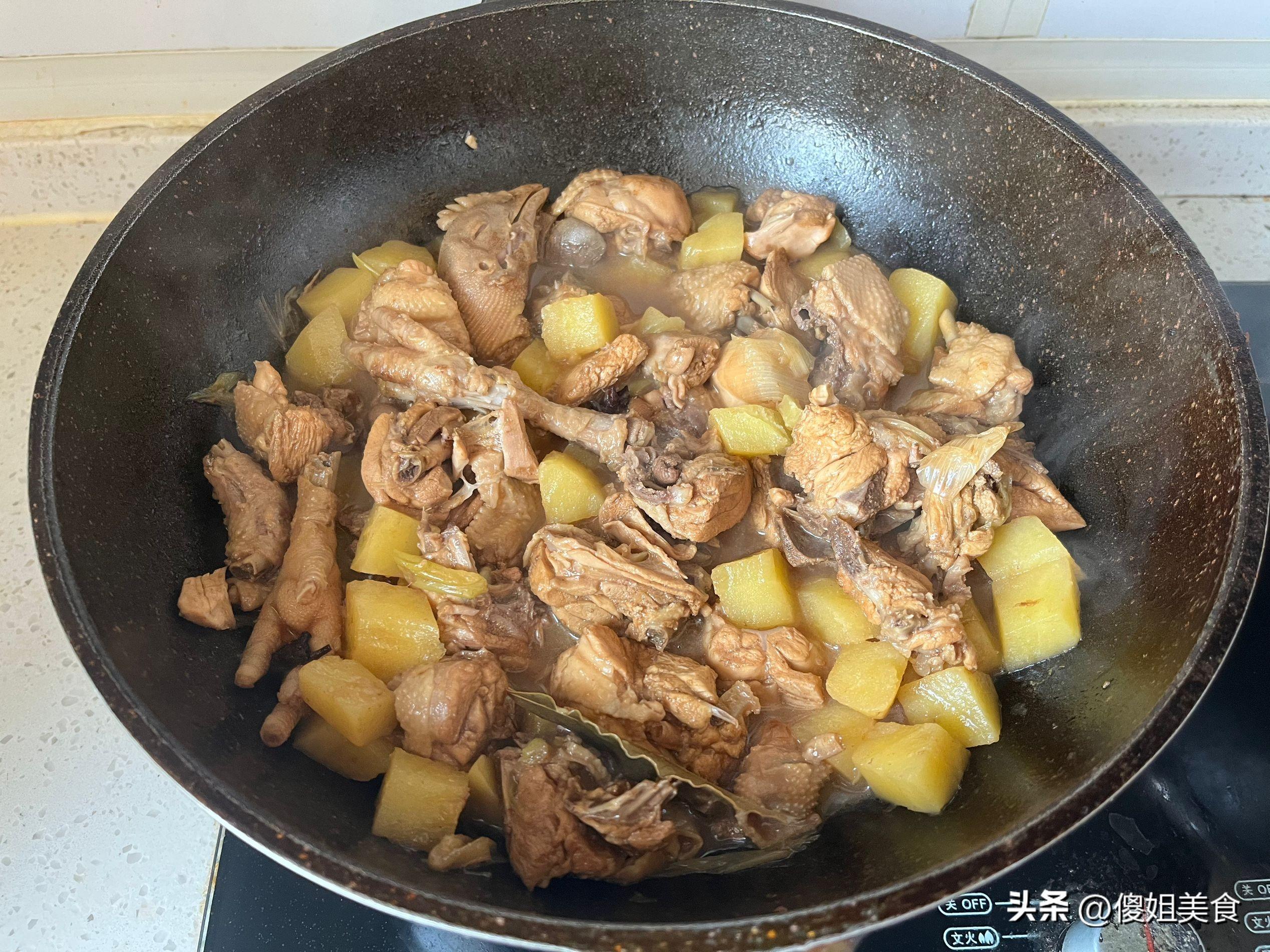 雞肉燉30分鐘後,撒上適量的鹽和切好的土豆塊,用勺子翻拌均勻,繼續中火燉,把土豆燉軟爛一些,婆婆和兒子特別喜歡喫入口即化的土豆塊,因此我燉的時間久一點。 最後大火再收一下湯汁就可以,喜歡喝雞湯的也可以不用收汁。