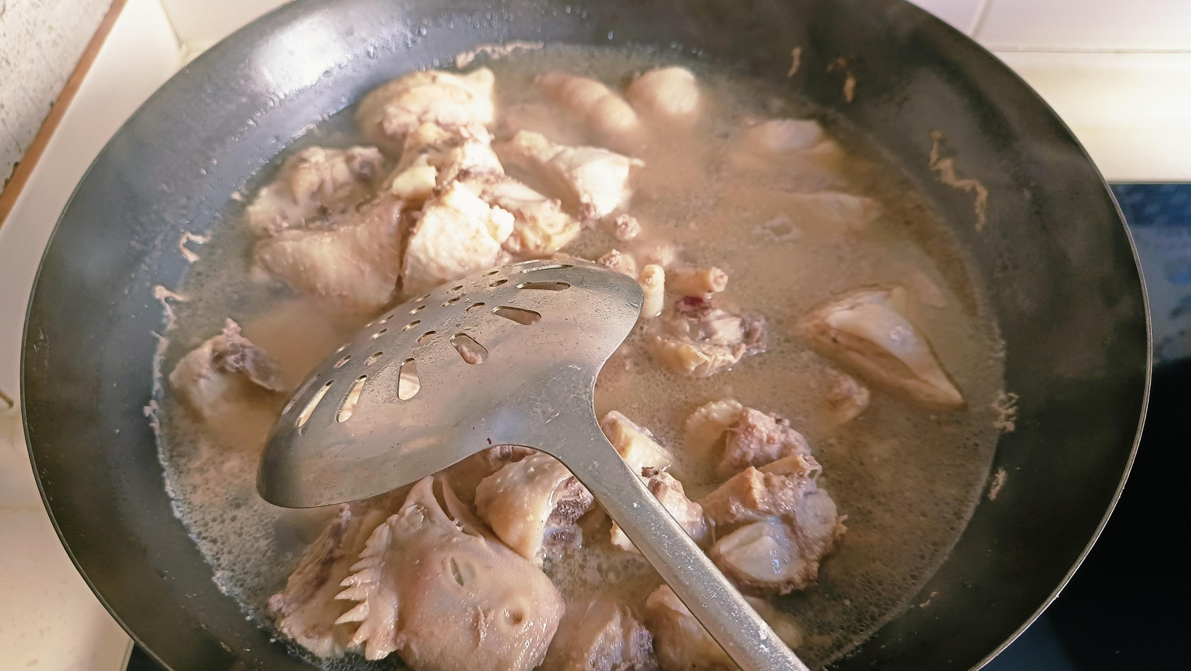 2.再起鍋加涼水,放入雞肉塊,加入適量的料酒,煮開後撇去浮沫,再繼續煮兩三分鐘後控水撈出備用。