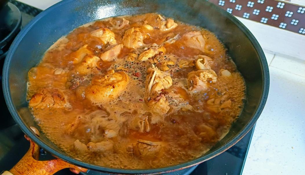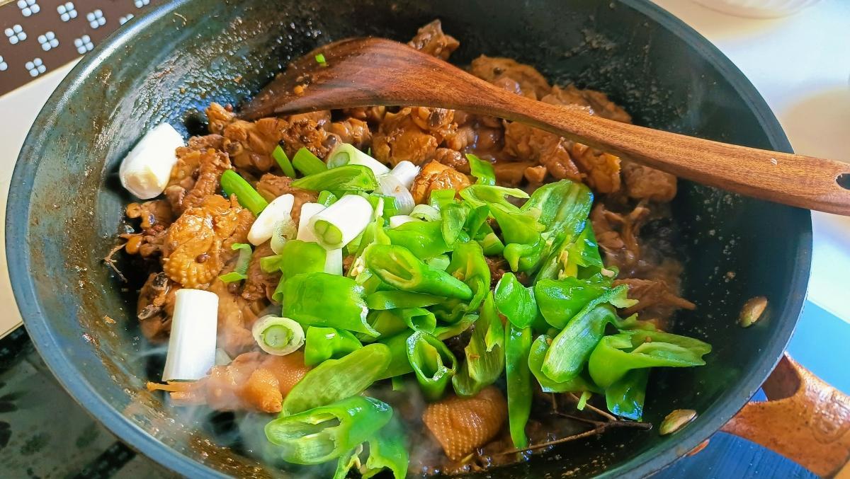 5.大火燒開後轉中小火繼續燉20~30分鐘(根據用的雞肉的老嫩程度適當調整),讓雞肉充分吸收料汁入味後開鍋,大火收一下湯汁,收至湯汁濃稠後,再加入蔥段、辣椒塊,接着適量的鹽、糖和雞精進行調味,大火翻炒均勻,使湯汁緊緊包裹在雞塊上,最後再滴入適量的香油,再次翻炒均勻後即可出鍋,太香了!