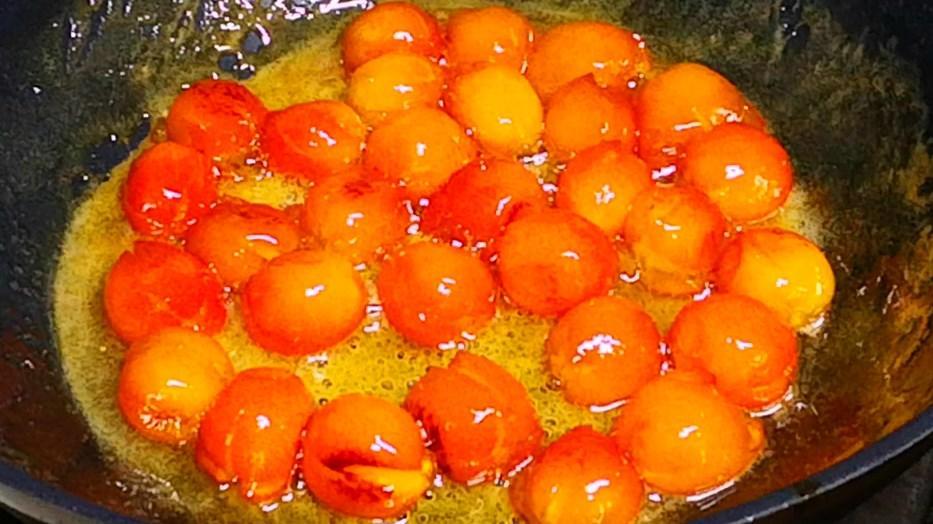 3、另起鍋加水,一斤金桔加600毫升水,100克冰糖,開大火燒開使冰糖完全融化、起大泡,我們倒入金桔,轉中火熬20分鐘。20分鐘後,擠入半個檸檬汁,這樣口感會更好,一定不要放入檸檬籽,否則會發苦的,繼續熬製湯汁粘稠,金桔晶瑩剔透,就可以出鍋了。