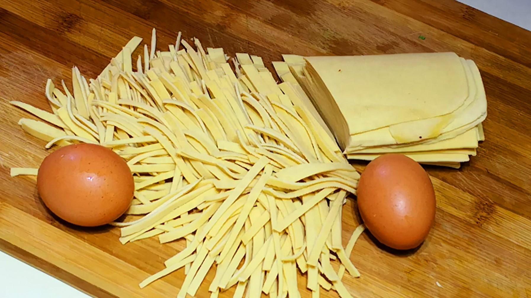 將雞蛋餅晾至不燙手後,再切成雞蛋絲。