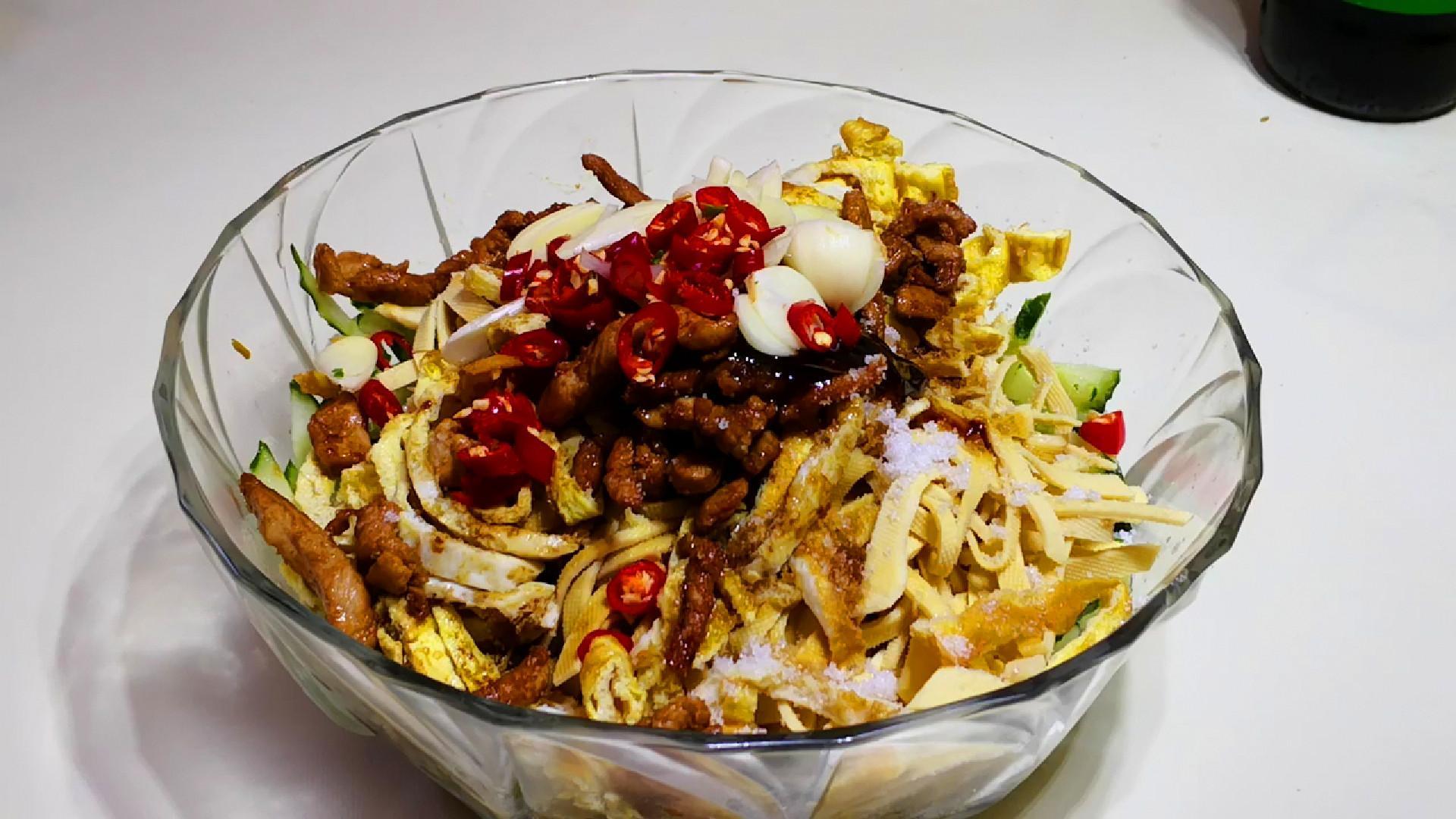 最後把所有的食材全都放到一起,蒜片和小米辣圈放在上面,然後澆上一勺燒開的熱油,激出香味後再加入2勺生抽、2勺陳醋、1勺香油、適量的食鹽、少許白糖提鮮、一勺辣椒油增加風味(不喫辣也可以不加)、少許雞精調味,攪拌均勻後裝入盤中,美味即成!