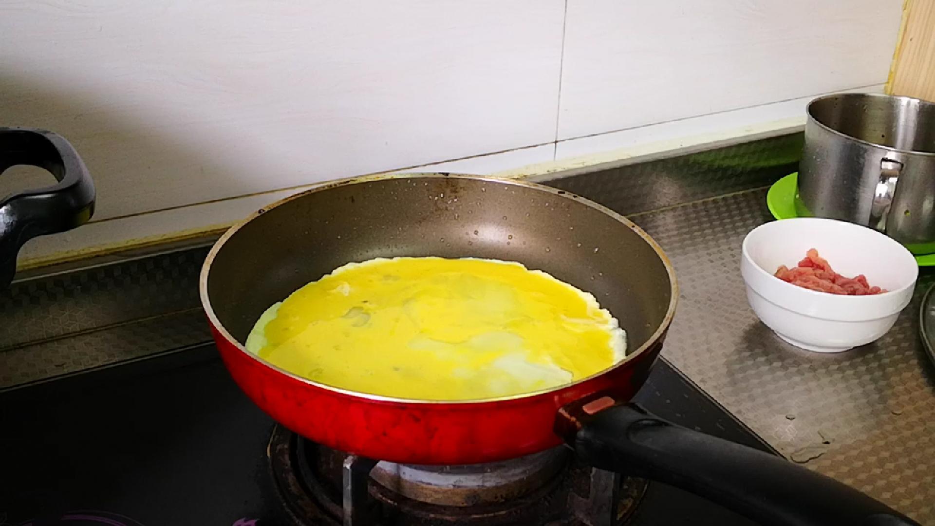 我們再來煎個雞蛋餅:取兩個雞蛋打入碗中,用筷子打散,取一個平底鍋,少加一點油,油溫4~5成熱時倒入蛋液,煎至定型後再翻面煎,煎至兩面都呈金黃色時關火出鍋。