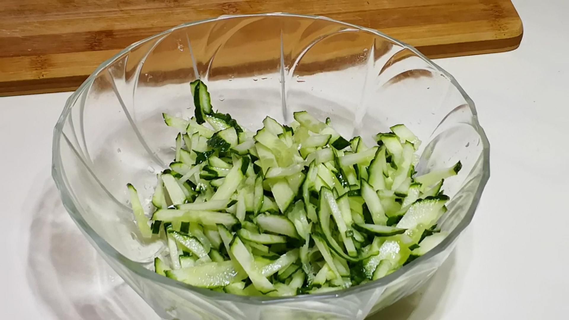 首先,我們準備一張新鮮的幹豆腐,清洗乾淨後切成均勻的細絲。然後起鍋加水,水開後加入一點點小蘇打,然後放入幹豆腐焯水,1分鐘後撈出幹豆腐過涼水,控幹水分後裝盆備用。