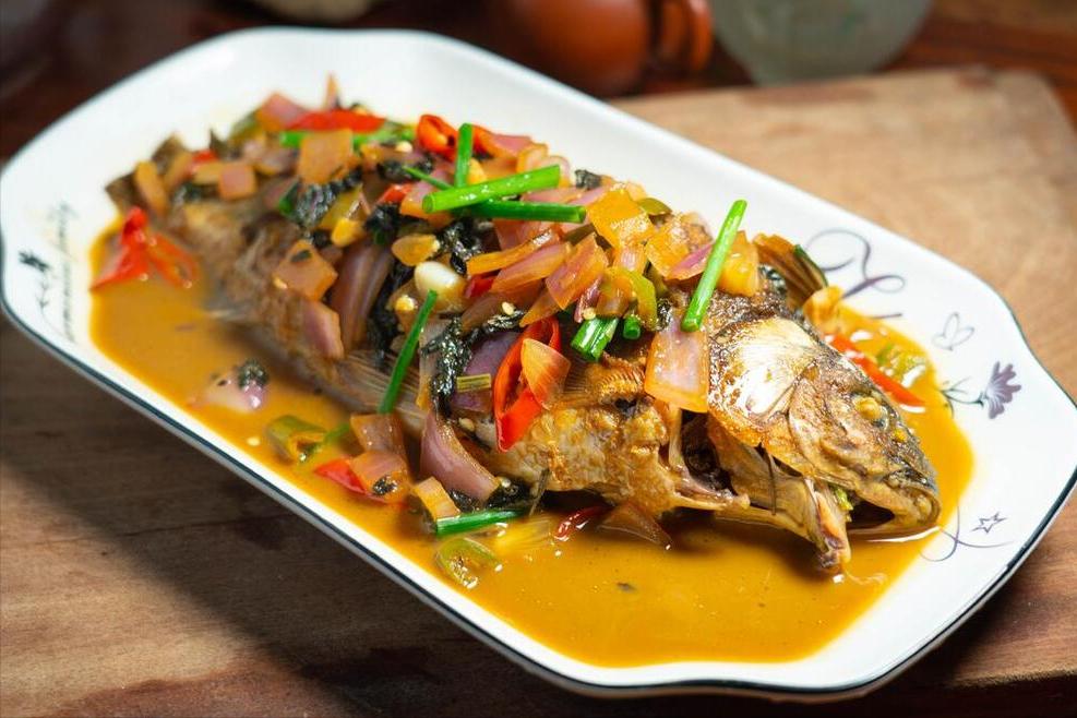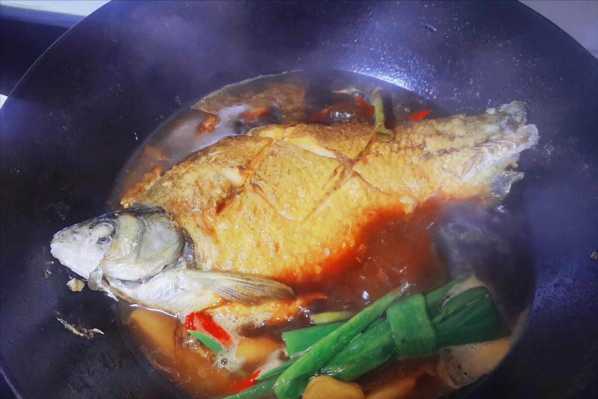 2、鍋內倒油,燒熱把魚下進去煎,兩面煎到金黃後,將小米椒、蔥薑蒜倒進去炒香,順便加上生抽、老抽、料酒、蠔油、鹽、味精、白糖來調味,然後添上和魚齊平的開水,燉上一會兒,直至湯汁濃郁後,出鍋開喫。