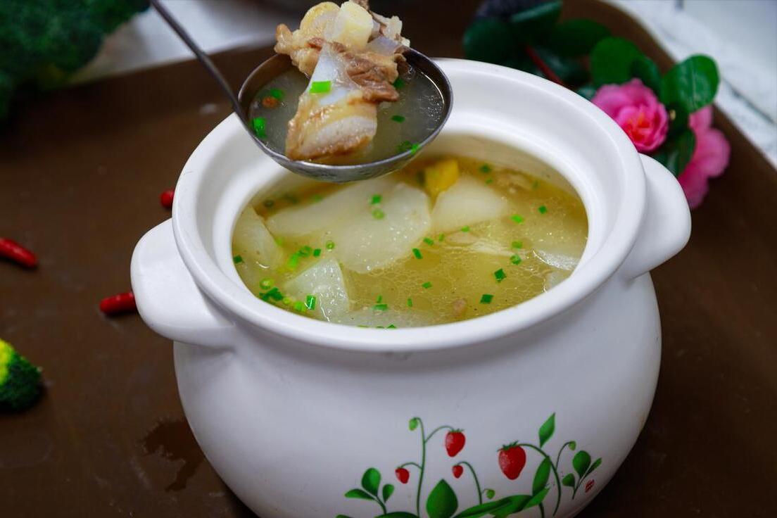 白蘿蔔切塊,排骨洗淨後冷水下鍋,加上薑片、料酒來焯水,煮出浮沫以後把這些髒東西都給撇出來,然後再將其用溫水沖洗乾淨。下面準備砂鍋,白蘿蔔、排骨、薑片一起加進去,大火燒開後小火繼續燉1個小時以上,最後加鹽調味,撒上蔥花開喝。