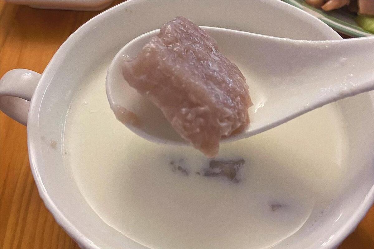 2、混合好之後,再把牛奶、糯米粉、煉乳都加進去,繼續充分攪拌,攪拌均勻以後揉成團,分成數個劑子,每一個都整理成漂亮的形狀。鍋中倒水燒開,將其下進去,大火燒開後,小火煮2分鐘後盛出來,最後倒上點椰奶調味,就可以開喝啦。