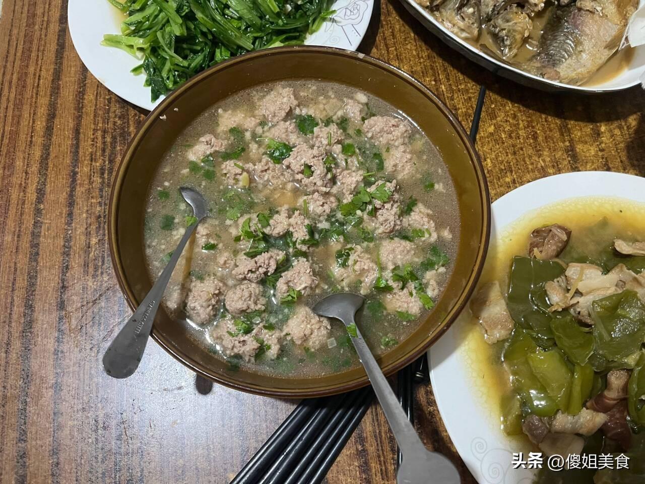 婆婆回老家時,我買了100塊錢的牛肉讓她帶回來給公公溜丸子喫,這陣子牛肉很便宜,才26元一斤,攪成肉餡,回家再剁一下,肉餡內放入蔥薑末、料酒、蠔油、味極鮮、香油、鹽,攪拌均勻就可以了。不用熗鍋,直接放入開水鍋內煮,煮熟的丸子湯撒上香菜、滴幾滴香油就出鍋了,滑嫩鮮香。