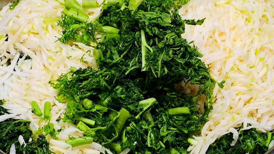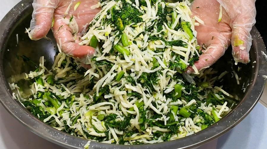 1、處理芥菜:這是一個比較大的工程,因爲芥菜本身坑坑窪窪的根部很容易藏匿沙土,如果洗不乾淨很是影響口感,洗的時候要用刷子仔細刷洗,實在洗不掉的部分,需要用刀削去;清洗好的芥菜要晾曬一下,目的是去除它的水分。