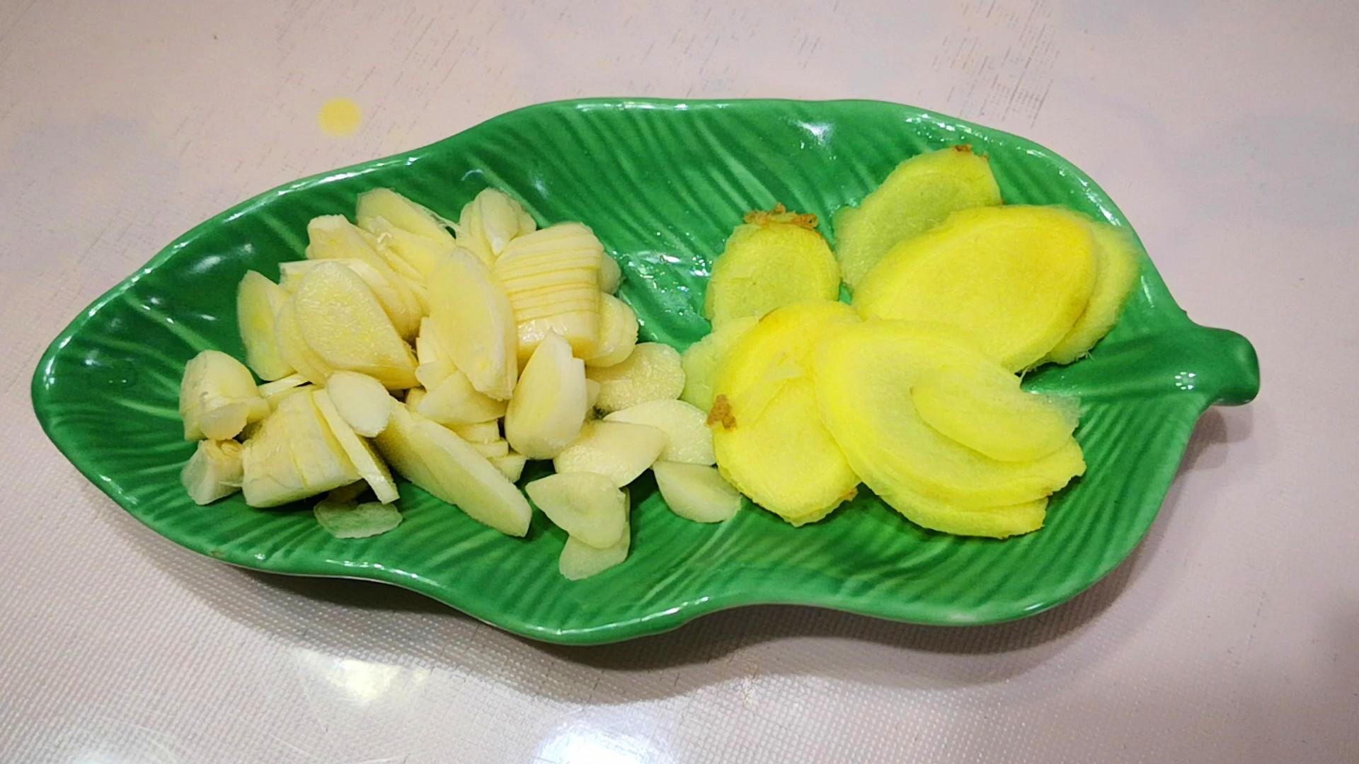 3.然後準備適量的大蒜和生薑,大蒜去皮後切成蒜片備用;生薑去皮後切成薑片備用。大蒜和生薑的量根據自己的喜好添加,喜歡喫可以多加一點,不喜歡就少加一點。我更喜歡喫醃蒜片,所以每次醃辣椒時都會放很多。
