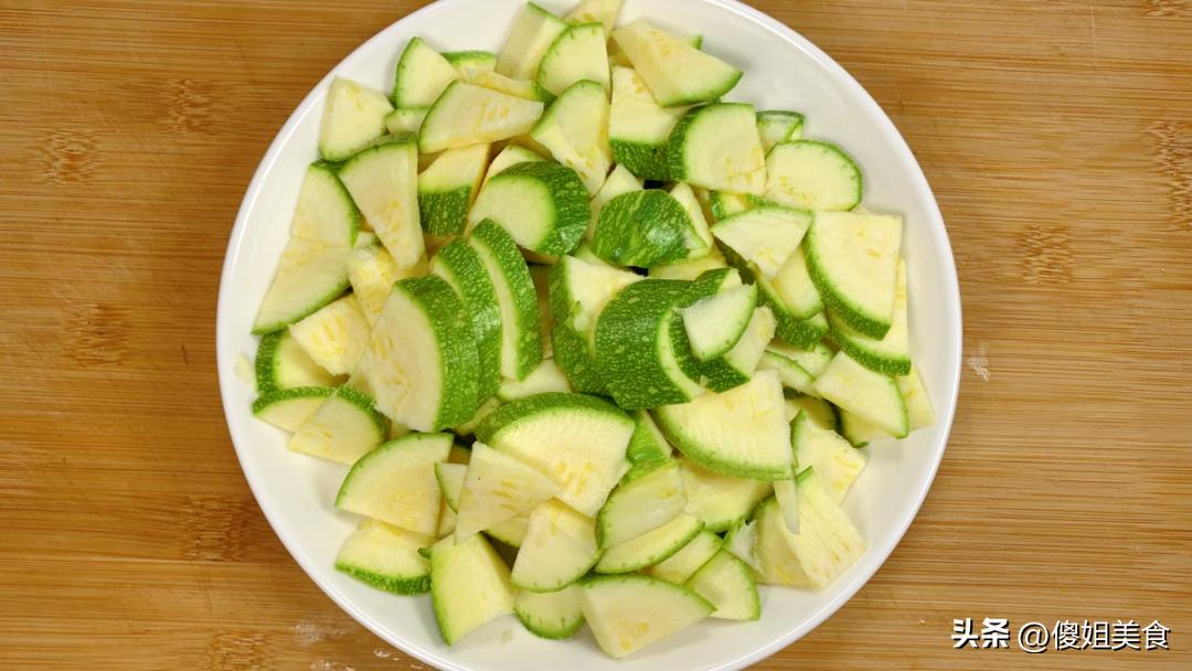 1、將西葫蘆清洗乾淨,先一分爲二,再分成長條,斜刀把切成厚片,裝盤備用。