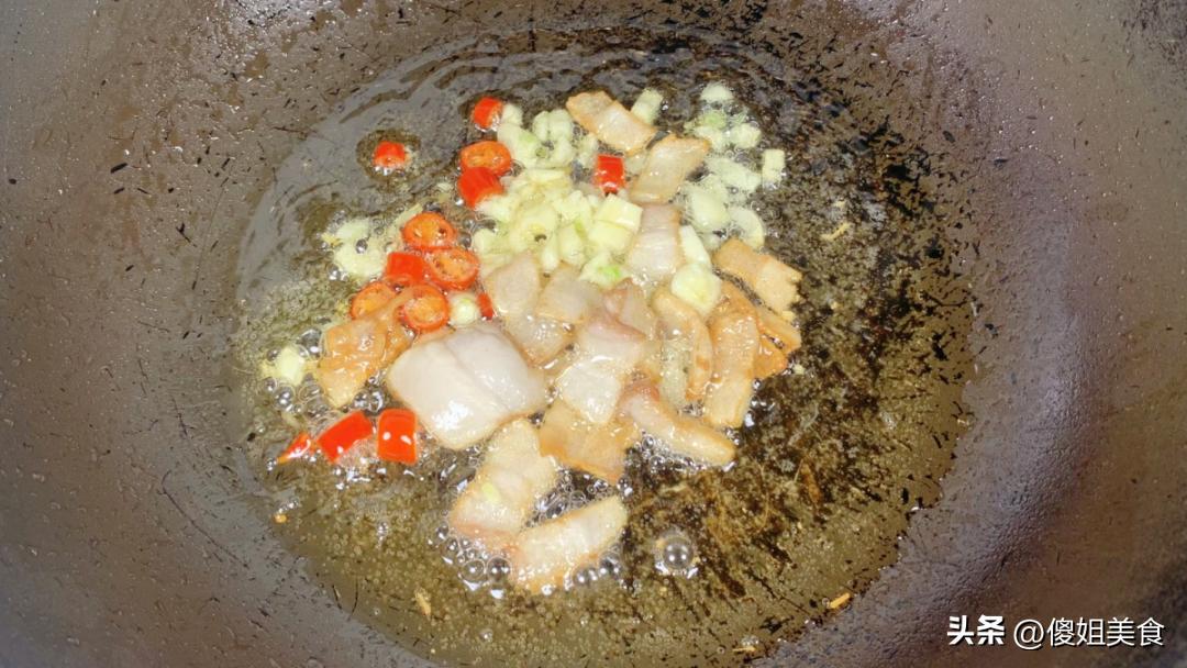 2、準備一塊五花肉,切成薄片放一旁備用。起鍋燒油,先放入五花肉片煸炒出香味,肉片炒至焦黃再倒入蒜末、薑末和小米椒,翻炒出香味。