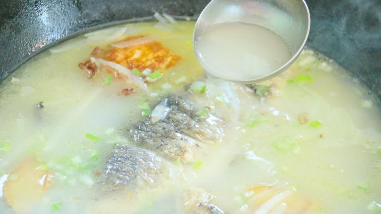 3鍋裏放油,放進鯽魚煎一下,兩面煎黃,加入溫水,大火煮開,這樣煮出的魚湯纔會奶白