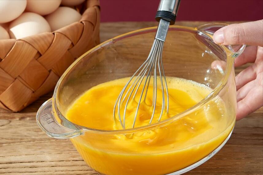 5、先倒上澱粉水,然後再倒上蛋液,這樣就可以保證做出來的蛋花湯,蛋花的形狀更漂亮,並且湯汁還會更香濃,澱粉水就是“多加1樣”。澱粉水倒進去以後,不需要攪拌,直接將蛋液倒入鍋中即可。