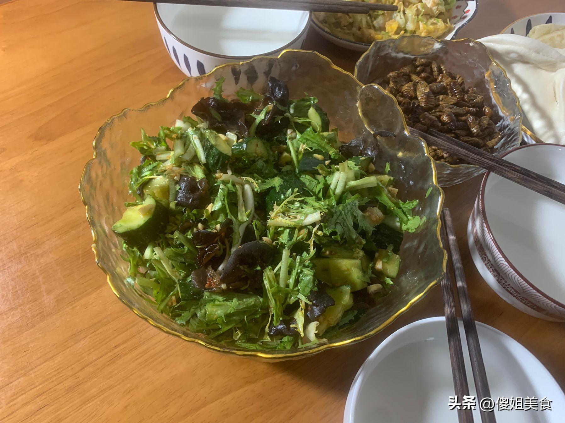 從動物園回來的路上有很多賣蔬菜的,路邊攤的東西比起超市會便宜很多,我就隨手買了點孩子們愛喫的蔬菜,有黃瓜、苦菊,買了2根黃瓜和2棵苦菊才花了2塊錢,是真便宜啊。回來後先取了點木耳用溫水泡開,然後又把黃瓜和苦菊各自清洗乾淨後切好備用,把着=這三種食材搭配好用蒜泥辣椒汁拌一下,開胃爽口又好喫,孩子們很愛喫,這一份涼菜在外面買的話最少10塊錢,自己做成本不到3塊錢。
