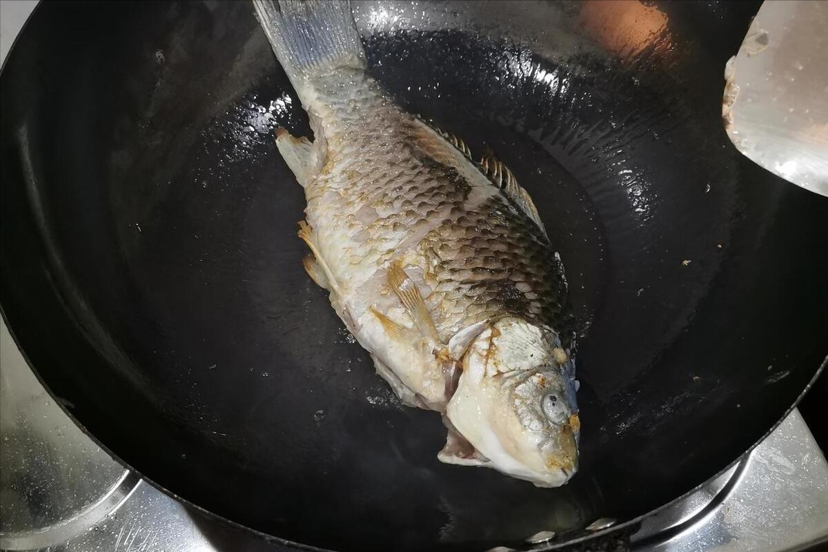 3、隨後再把鯽魚倒進去開始煎,把兩個面都煎到色澤金黃爲止,在燉之前提前把魚煎一下,這樣燉出來味道更香,湯汁更濃郁,並且還能燉出奶白的顏色,這就是需要掌握的第1個訣竅。
