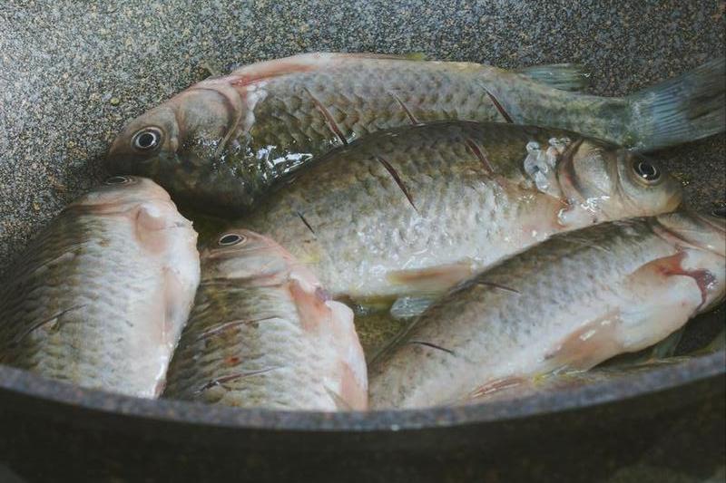 1、準備幾條魚,我這裏用的鯽魚,如果個頭小的話就多準備幾條,把魚鱗、內臟什麼的統統處理乾淨,然後放入水中多清洗幾遍,控幹水分。