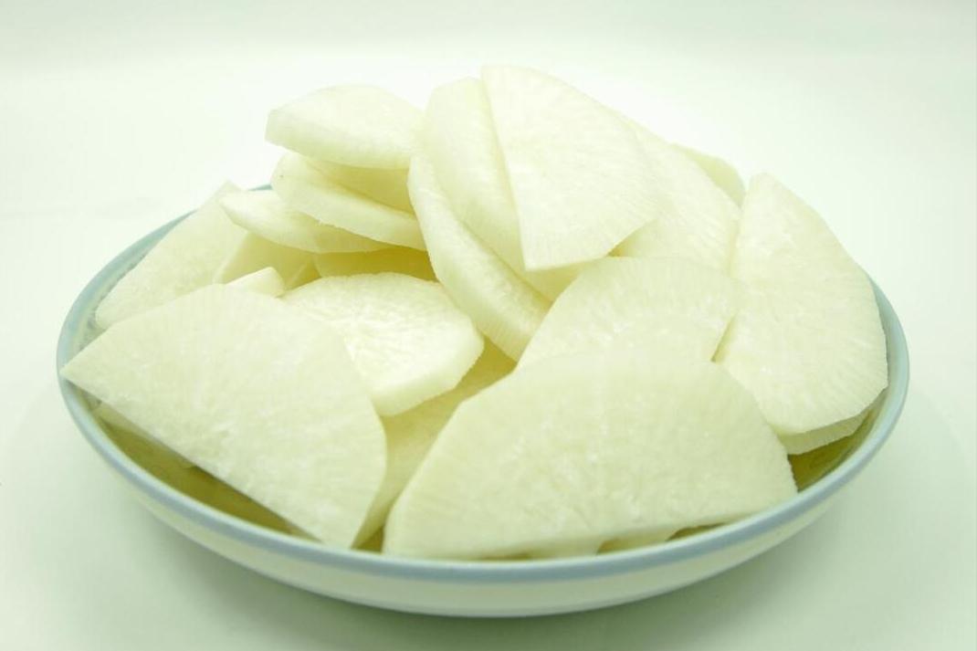 1、準備好蘿蔔,把蘿蔔放在水裏稍微清洗一下,洗淨以後要把上面的水分,用廚房紙給擦乾,然後切成片狀。