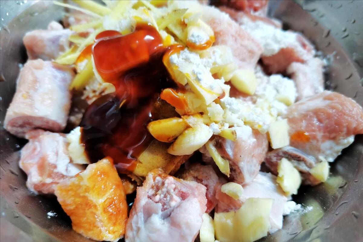 2、泡好以後的排骨,重新用清水沖洗乾淨,然後將其水分控幹後,重新裝在一個乾淨的小盆裏,接下來把蔥薑蒜全部切碎後,倒在裏面,然後加上1勺澱粉、1勺五香粉、少許鹽、味精、白胡椒粉,再來3勺生抽、1勺老抽、1勺料酒、1勺蠔油。