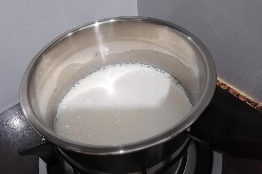 4、下面開始加熱,好多人會選擇把牛奶完全加熱至沸騰,然後直接倒入薑汁中,完全大錯特錯!正確的做法是,只需要把鍋內的牛奶,加熱至70度左右即可,這個溫度來做姜撞奶,是最容易成功的,這是第3個要點。