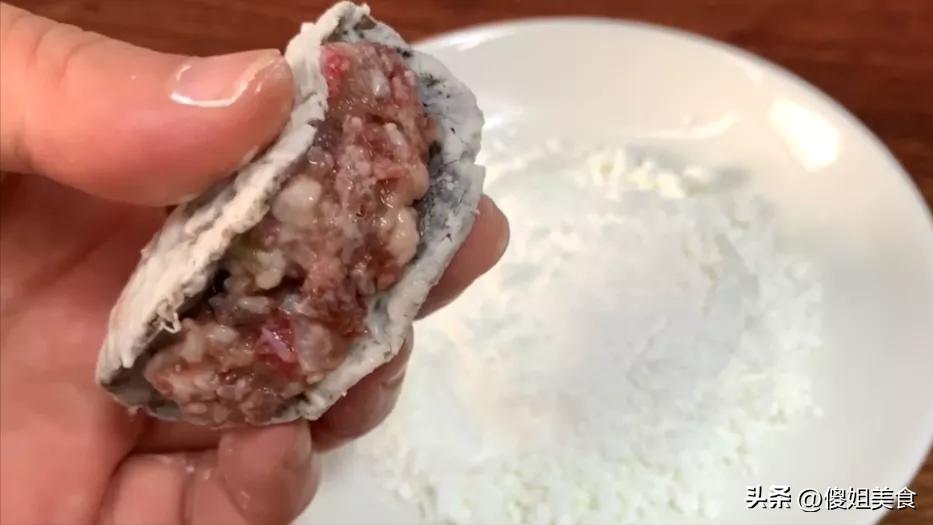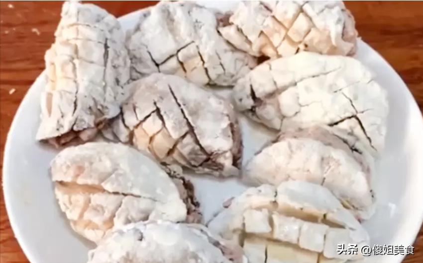 步驟四:裹上澱粉,將夾好牛肉餡的香菇放在盤子裏,每個香菇均勻地裹上一層幹澱粉。裹上澱粉可以讓香菇在炸的時候更加酥脆,同時也能鎖住香菇和牛肉的鮮美汁水。