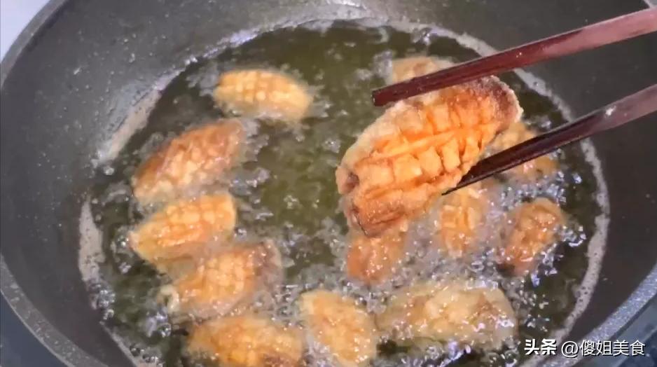 步驟五:油鍋炸制,在鍋中倒入適量的食用油,油熱至七成時,將裹好澱粉的香菇逐個放入油鍋中,小火慢炸。炸的時候要不斷翻動香菇,保證其受熱均勻。等到香菇表面炸至金黃酥脆時,就可以撈出來瀝乾油了。
