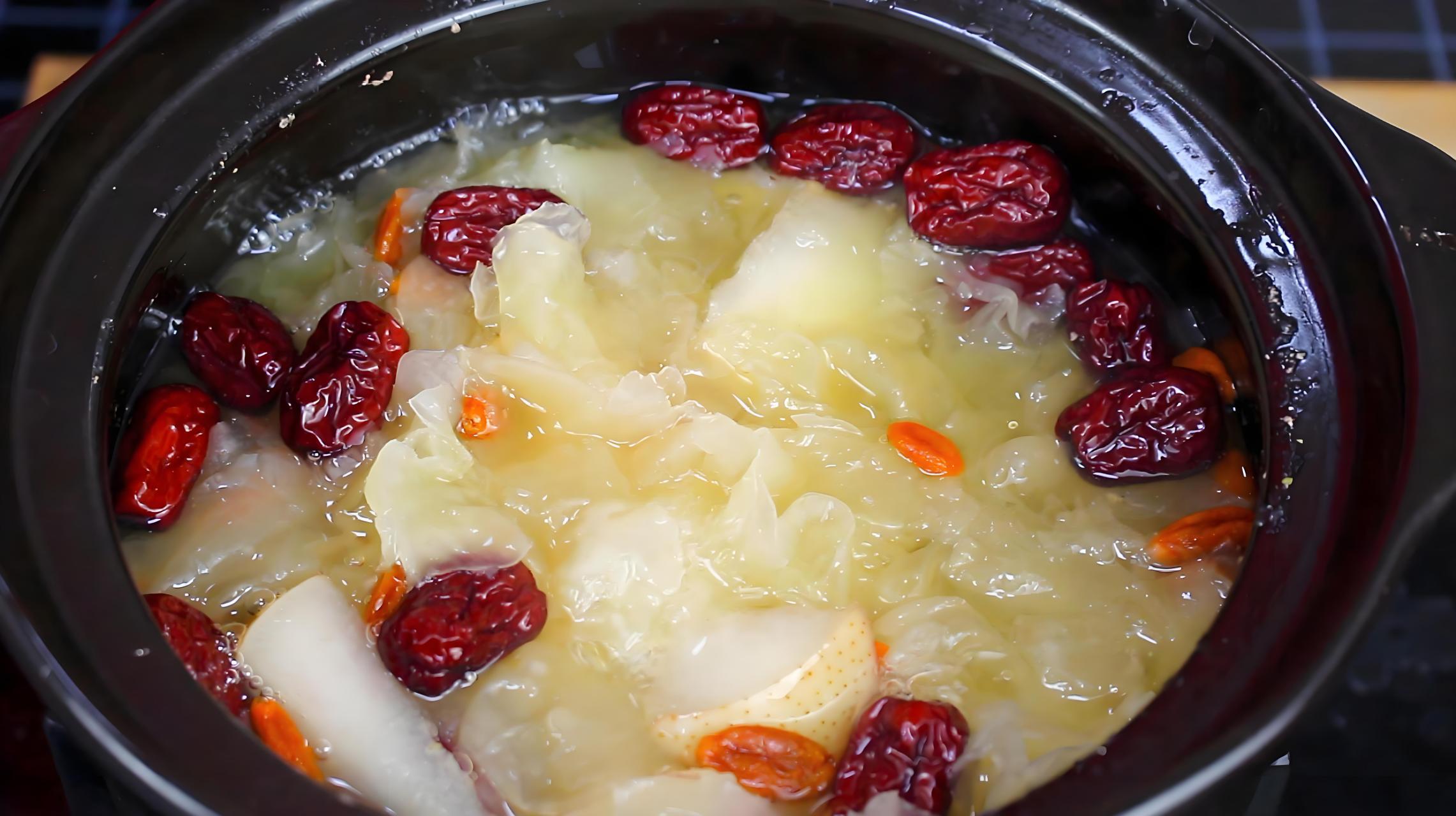 4煮沸後,轉小火繼續燉煮,讓食材煮爛,銀耳裏面的膠質煮出來