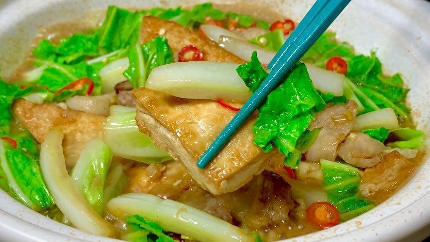 - 操作步驟:豆腐切塊,放入鹽水中浸泡片刻,以去除豆腥味並增加豆腐的韌性。白菜葉撕成大片,洗淨備用。五花肉切片,蔥薑蒜切末。熱鍋涼油,放入五花肉煸炒至出油,加入蔥薑蒜末、八角炒香。放入生抽、老抽翻炒均勻,加入適量清水煮開。放入豆腐塊,輕輕翻炒均勻,蓋上鍋蓋燜煮幾分鐘,讓豆腐充分吸收湯汁的味道。最後放入白菜葉,繼續燉煮至白菜變軟,加鹽、雞精調味即可出鍋。