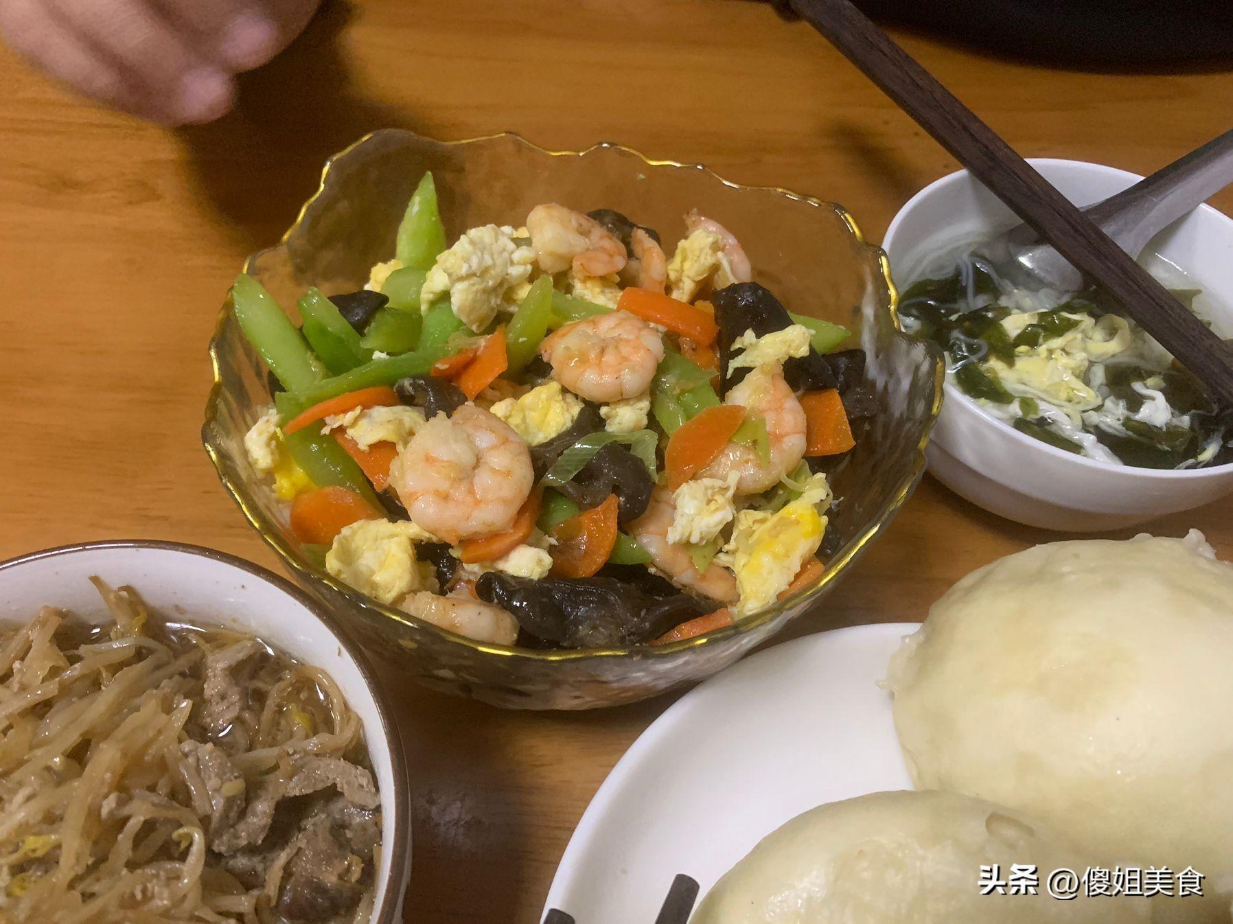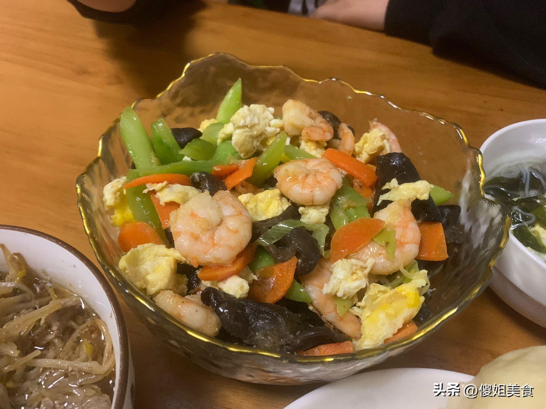 平時婆婆不在,很少在家裏做飯,都是在外面的快餐店喫,或者點外賣。總買着喫孩子們都喫夠了,強烈要求我做飯,對於我這個不會做飯的寶媽來講,只能去嘗試。好長時間沒喫青菜了,我就把冰箱裏的黃瓜、木耳、胡蘿蔔都拿出來了,還有點蝦仁搭配炒一下,想着肯定好喫,炒的時候還加了2個雞蛋,炒熟後味道超鮮美,孩子們都愛喫,一大碗都喫光了。