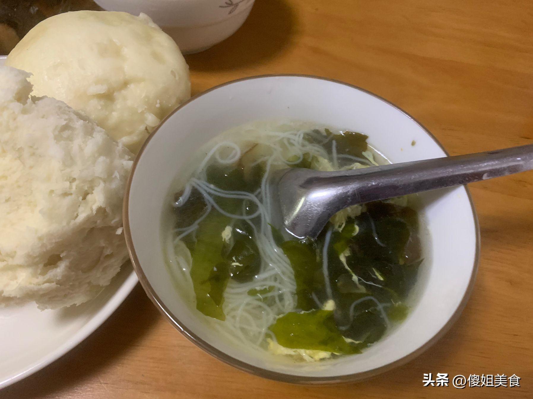 好久沒有喝湯了,娘三個嘴裏都上火了,晚上就打了個雞蛋湯,提前把裙帶菜用清水泡開,切成小塊。煮湯的時候不用熗鍋,直接放入開水鍋中,淋入一個雞蛋液,再放上一小把龍口粉絲,放入胡椒粉、少許鹽、味極鮮調味,食材煮熟後關火,滴2滴香油增香,攪動均勻盛入碗內就可以。