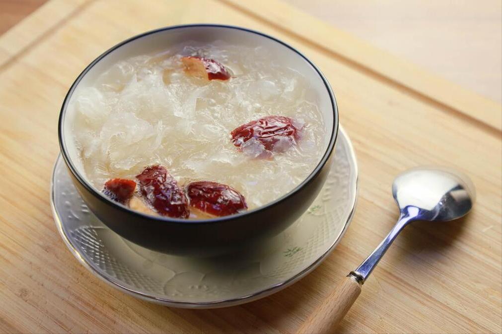 紅棗、枸杞洗淨,銀耳泡發好也洗淨,然後撕成小塊,倒在鍋子裏,順便把紅棗也一起加進去,接下來添上清水來燉。保持大火燒開後,改爲最小火繼續燉,燉上半個小時這樣,用勺子快速攪拌一下,攪拌出膠後,繼續煮10分鐘,最後放入枸杞和冰糖,就可以開喝啦。