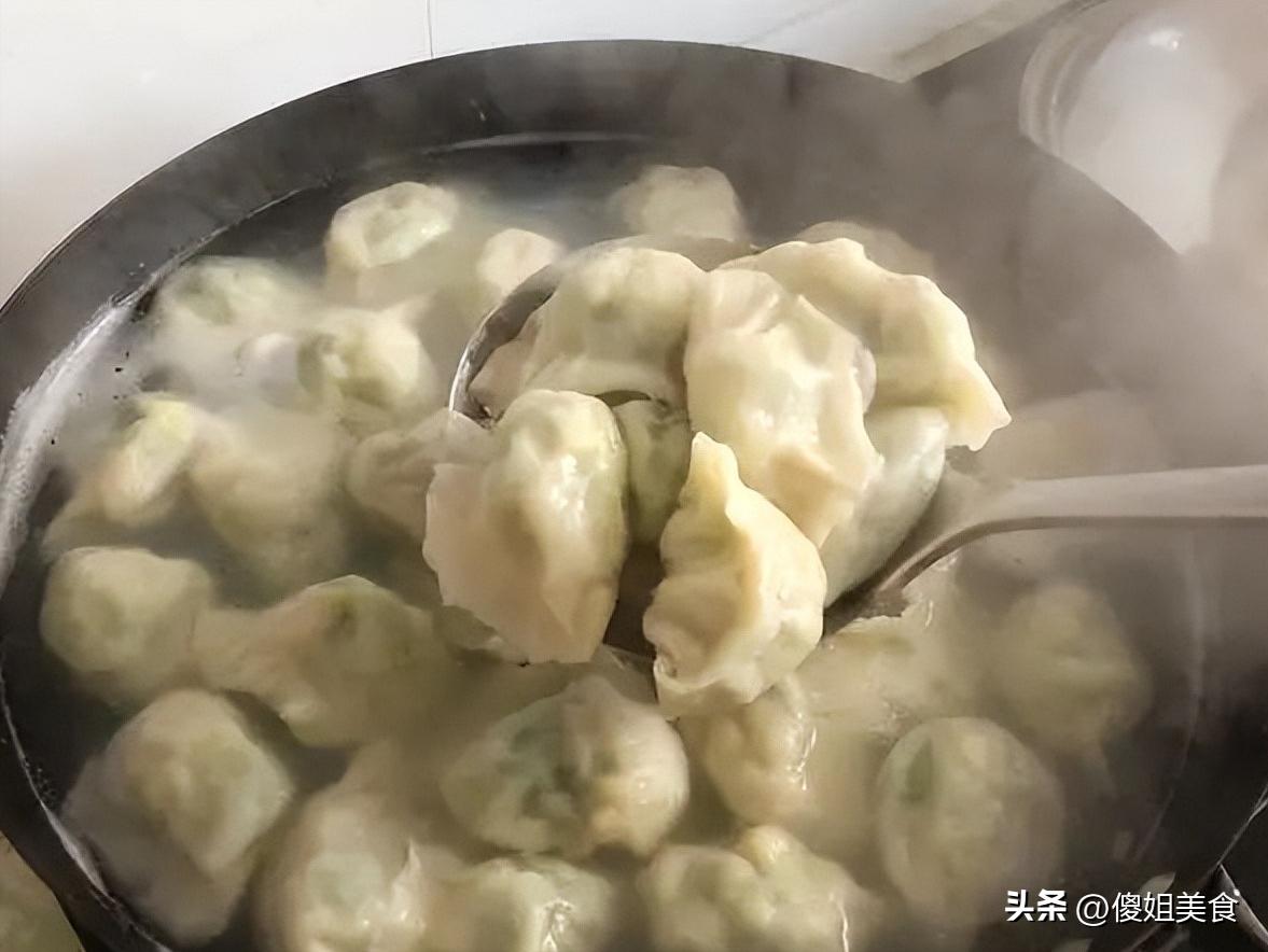 5、鍋中加入足量的水,煮至沸騰後放入餃子,用勺子輕輕推動,防止餃子粘鍋。待水再次沸騰後加入一碗冷水,重複兩次,餃子漂浮在水面時即可撈出。