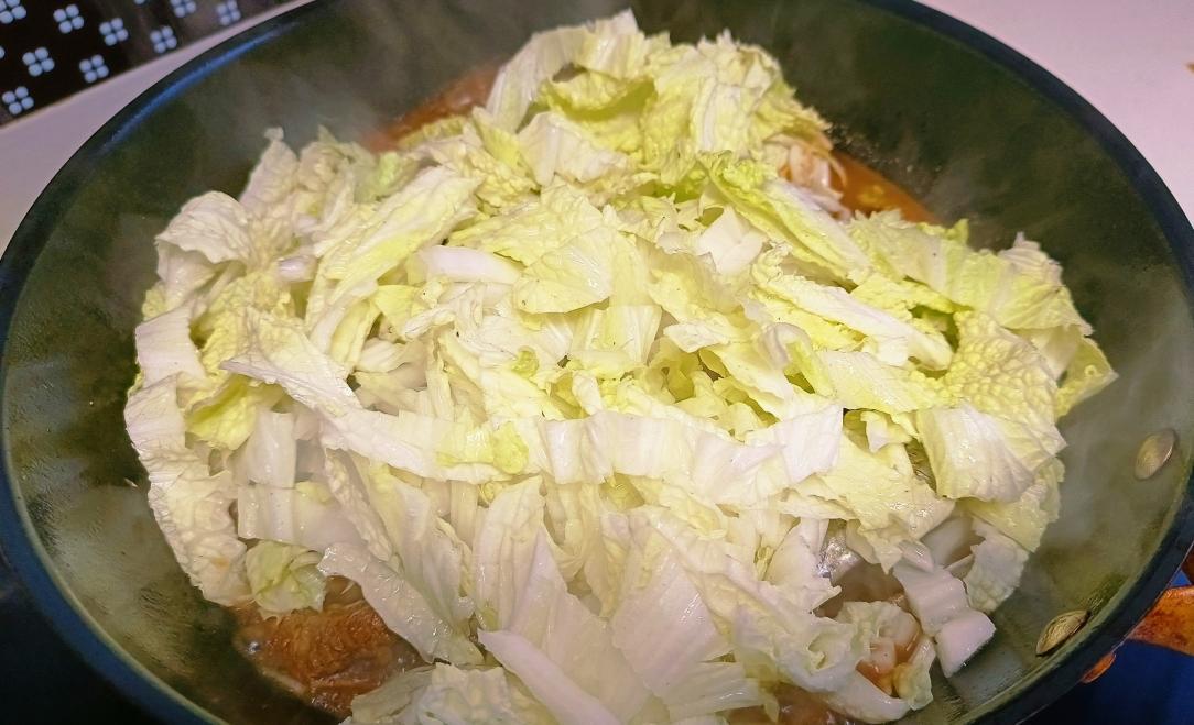 4.大家約燉15分鐘左右後開鍋,把白菜葉子放入,再加入適量食鹽調味,然後蓋好鍋蓋繼續燉。