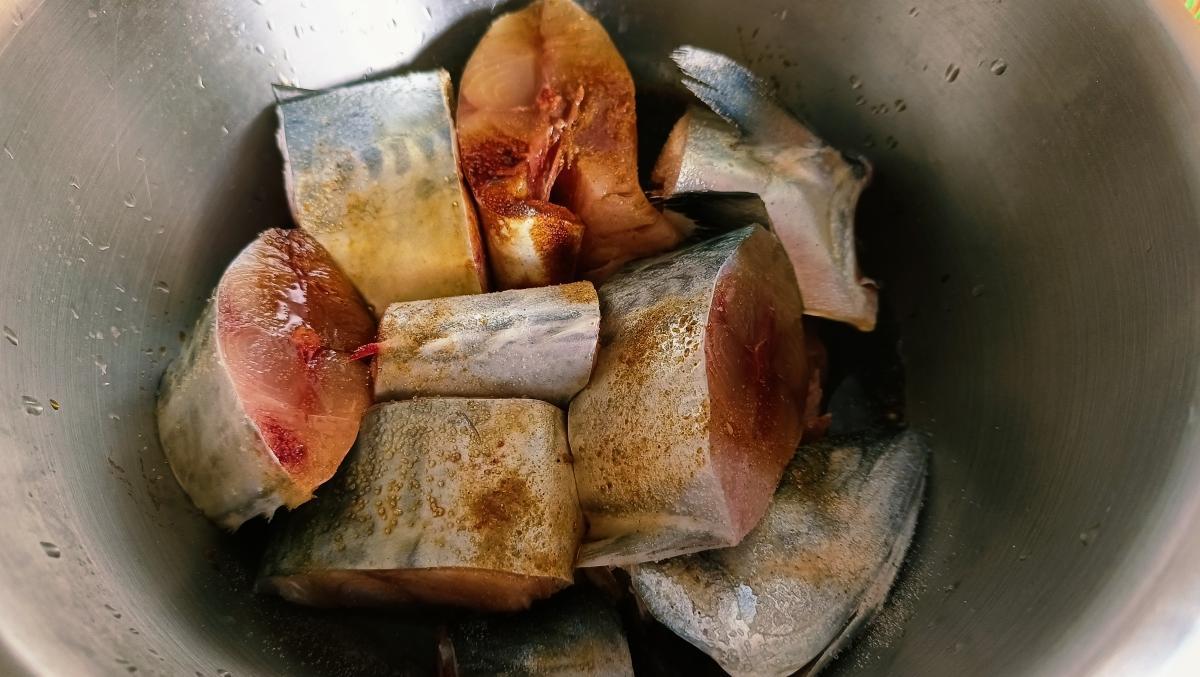 然後把處理好的魚分成小段後放入盆中,加入適量的食鹽、料酒、生抽、少許老抽和花椒粉,攪拌均勻後醃製半個小時,讓魚肉入味,中間可以上下翻動幾遍,讓魚肉入味均勻。