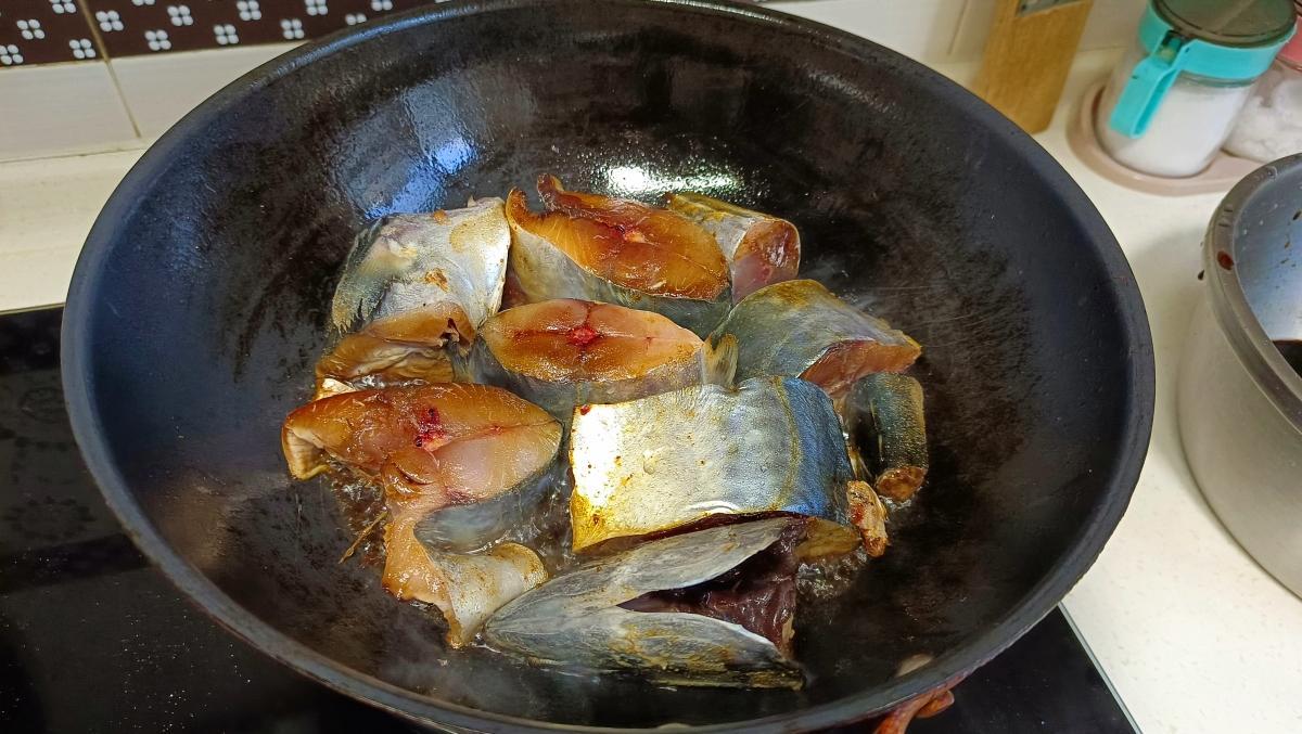 3.起鍋加油,油熱後先放入醃製入味的鮁魚段,煎至魚身表面呈金黃色時把魚段推到鍋邊,然後下入蔥花、薑末和蒜末爆香,接着將醃製魚肉的料汁倒入鍋中,再加入適量的清水,水量要沒過魚段,蓋好鍋蓋,大火燒開後轉成小火慢慢燉。
