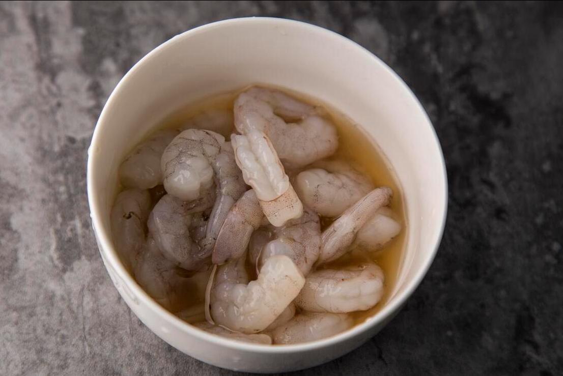 1、首先把大蝦準備好,來處理一下,把大蝦中的蝦仁剝出來以後,放在水中洗淨,然後把水分控幹,將其盛在小碗中。
