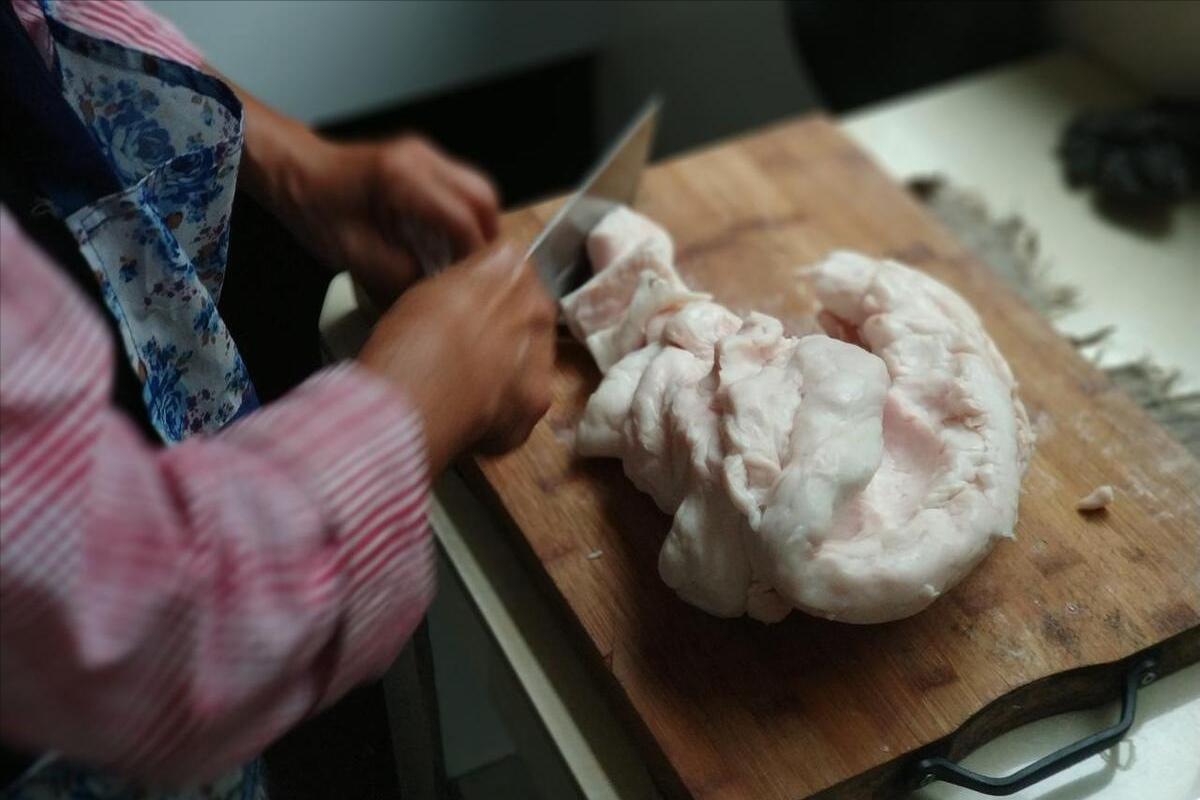 1、首先咱們要準備一塊豬板油,把豬板油倒在水中來清洗一下,多清洗2遍,把上面的髒東西洗淨以後,瀝乾水分,切成小塊。