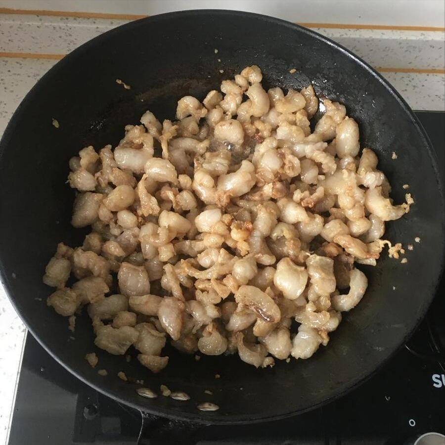 5、繼續用勺子不停的攪動,出油之後攪動頻率就得高起來了,不然容易糊。不停的翻動,直至豬板油變成豬油渣,變得焦香、金黃之後,就說明裏面沒有油分可以出了,這個時候我們就可以關火了。