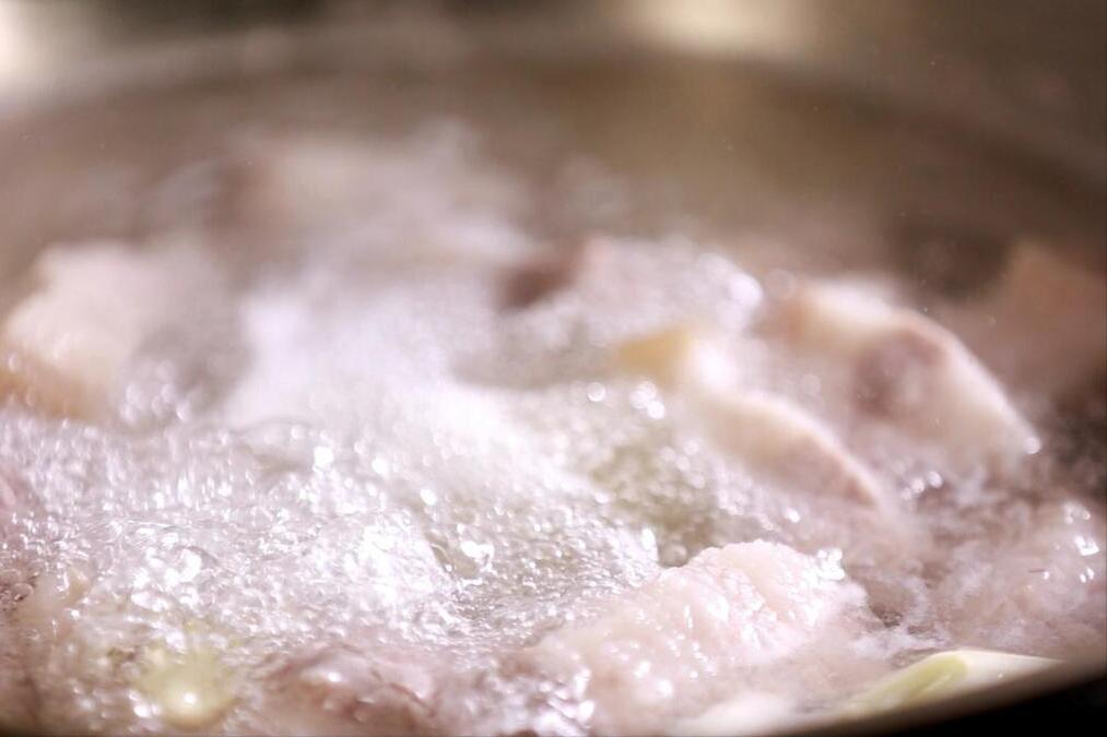 2、接下來,如果嫌豬板油味道大的話,其實咱們可以下鍋焯水,這樣可以去除一大部分的腥味、異味,如果覺得能接受的話,那就算了。接下來咱們就把豬板油給倒在鍋子裏,隨後往裏面添上清水。