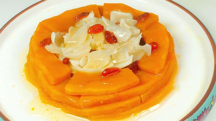 - 把百合放在蒸過的南瓜上,撒上適量冰糖,再蒸 5 - 8 分鐘,至百合熟透。取出蒸好的百合南瓜,根據個人口味淋上少許蜂蜜即可。