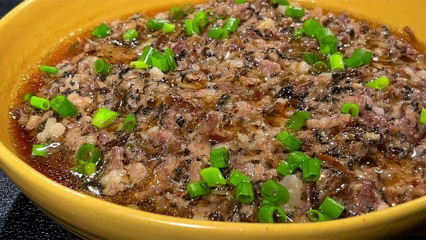 - 將梅菜豬肉末放入蒸鍋中,整形後,大火蒸 15 - 20 分鐘,至肉餅熟透,撒上蔥花即可。