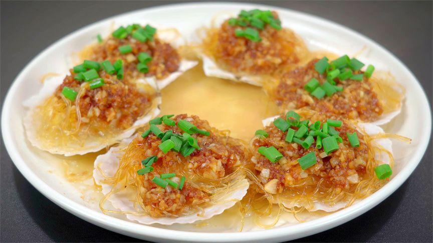 - 將泡軟的粉絲放在貝殼上,再放上扇貝肉,淋上蒜蓉醬。放入蒸鍋中,大火蒸 5 - 8 分鐘,至扇貝肉熟透,撒上蔥花即可。