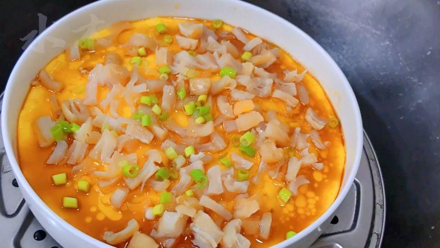 - 碗口蓋上保鮮膜,用牙籤扎一些小孔,放入蒸鍋中,小火蒸 10 - 12 分鐘,至蛋液凝固。取出蒸蛋,淋上生抽和香油,撒上蔥花即可。