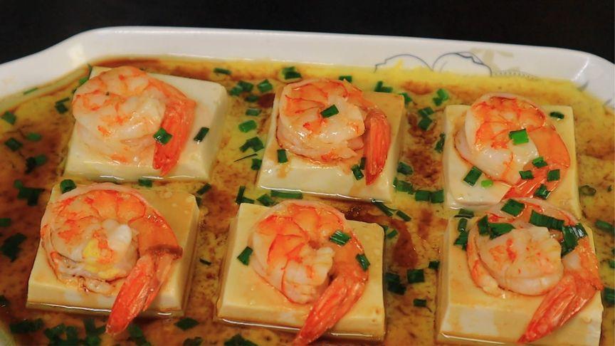 - 將炒過的蝦仁放在蒸過的豆腐上,淋上調好的汁,再次放入蒸鍋中,大火蒸 3 - 5 分鐘,撒上蔥花即可。