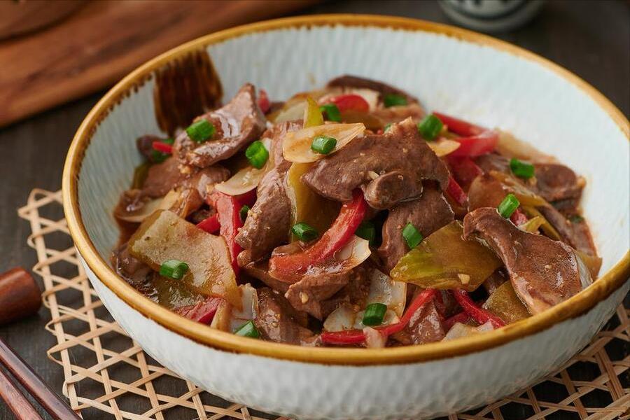 食材:豬肝、蔥薑蒜、青紅辣椒、小米椒、洋蔥、鹽、白胡椒粉、雞精、生抽、蠔油、料酒