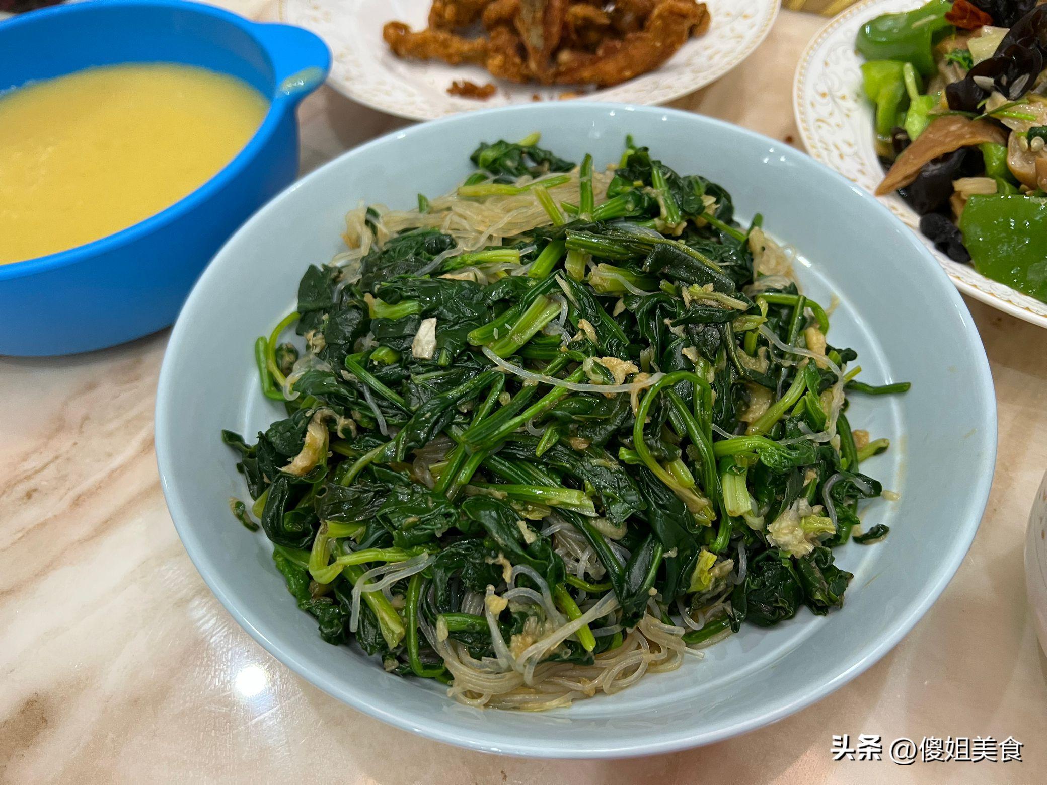 還有一道涼拌菠菜粉條。菠菜洗乾淨焯水,粉條煮熟過涼水,然後放在一起,加上蒜末、辣椒油、生抽、醋、鹽、糖、香油,一拌,清爽可口,特別解膩。雖然就這三個菜,但是我們一家五口吃得特別開心。一家人圍坐在桌前,有說有笑,那種溫馨的氛圍讓我覺得特別幸福。婆婆也一直誇我手藝好,說這頓飯喫得心裏暖暖的。