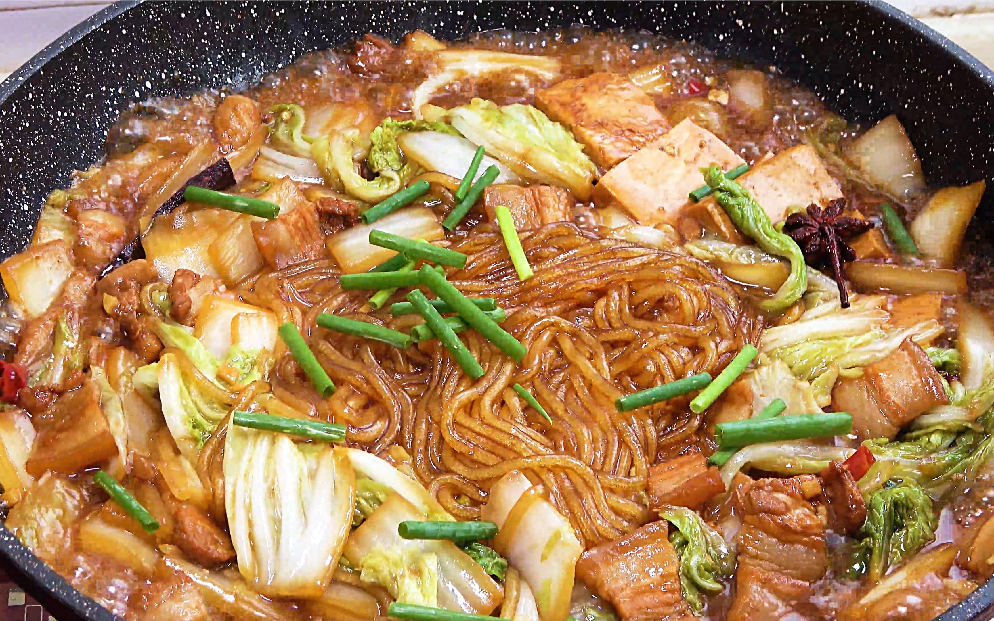 2大白菜清洗,切塊,豆腐沖洗,切厚塊,乾粉條用熱水泡軟