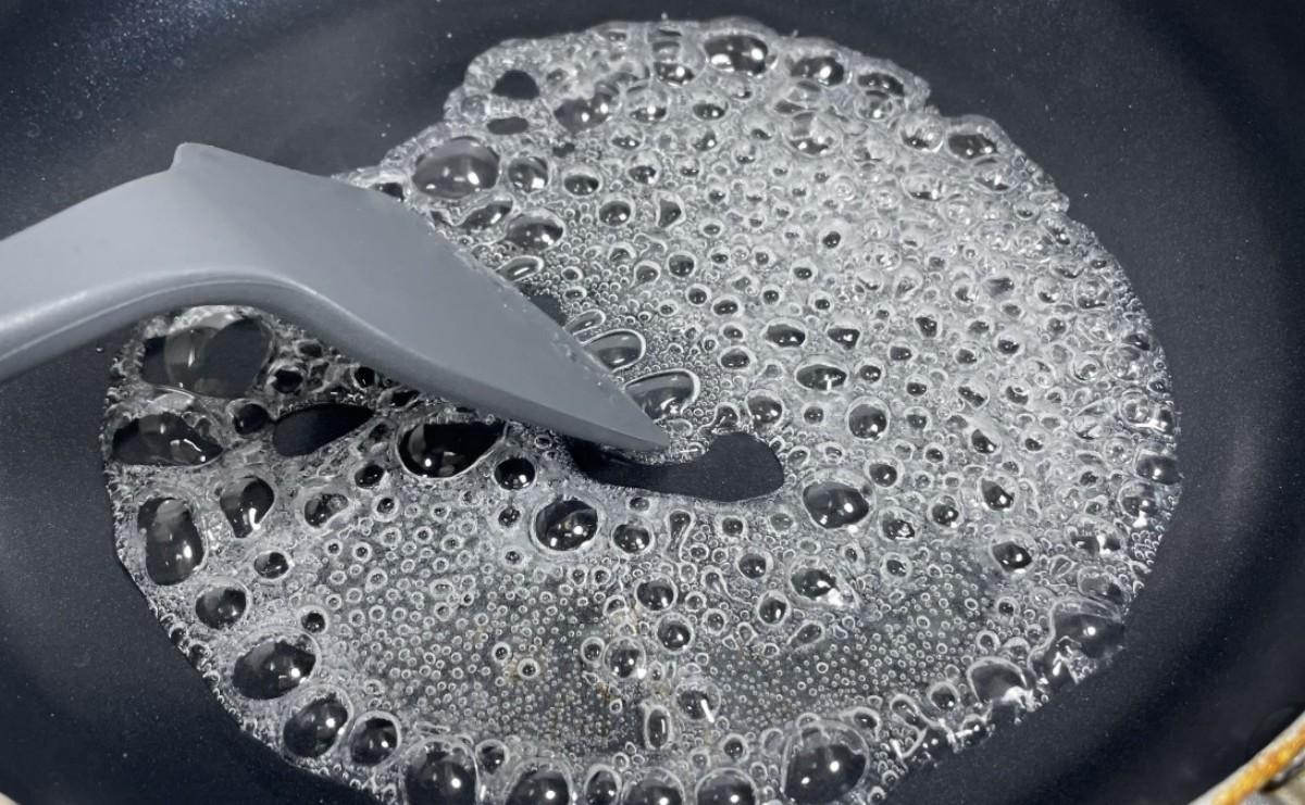 3、鍋中按1:2的比例加入開水和白砂糖熬成糖稀,開始的時候可以攪拌,水開後就不要攪拌了,以免糖稀反砂,也就是熬好的糖再次凝固成顆粒,這就是熬糖失敗了。水開後,火要隨小些,保持火苗位置跟糖液持平即可,不要把邊緣燒糊。糖液開始時都是白色的大泡,會逐漸變黃變成密集的小泡。