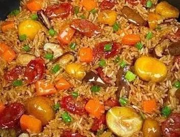 2. 鍋中熱油,放入洋蔥炒香,加入臘腸、香菇、胡蘿蔔翻炒,再放入板栗。