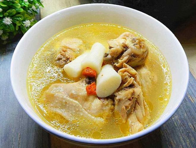 食材:山藥1根,母雞1只,枸杞1把,姜,蔥, 胡椒粉